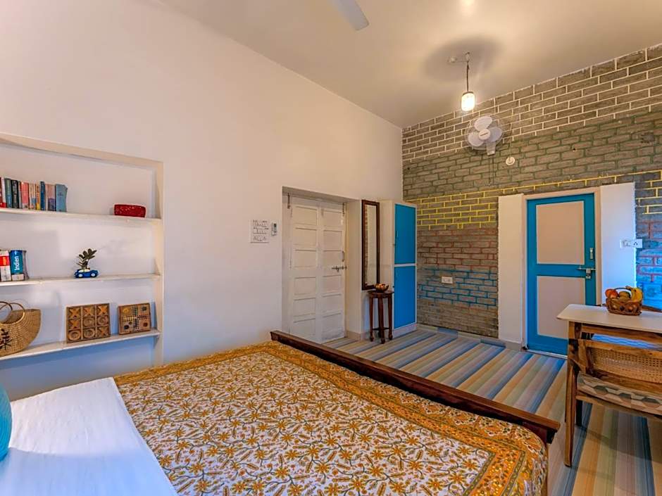 This is a private room with a queen sized bed for two, air conditioning, windows, curtains, wooden flooring, traditional rugs, international charging points, exquisite bed lamps, coffee table and seating, cupboard, trash bins, private bathroom.